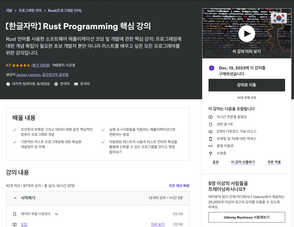 그래서 러스트 관련 강의를 보던 중 가장 기초적인 내용을 쉽게 학습할 수 있고 괜찮아 보이던 강의를 찾던 중 이 Rust Programming 핵심 강의를 찾게 되었습니다.